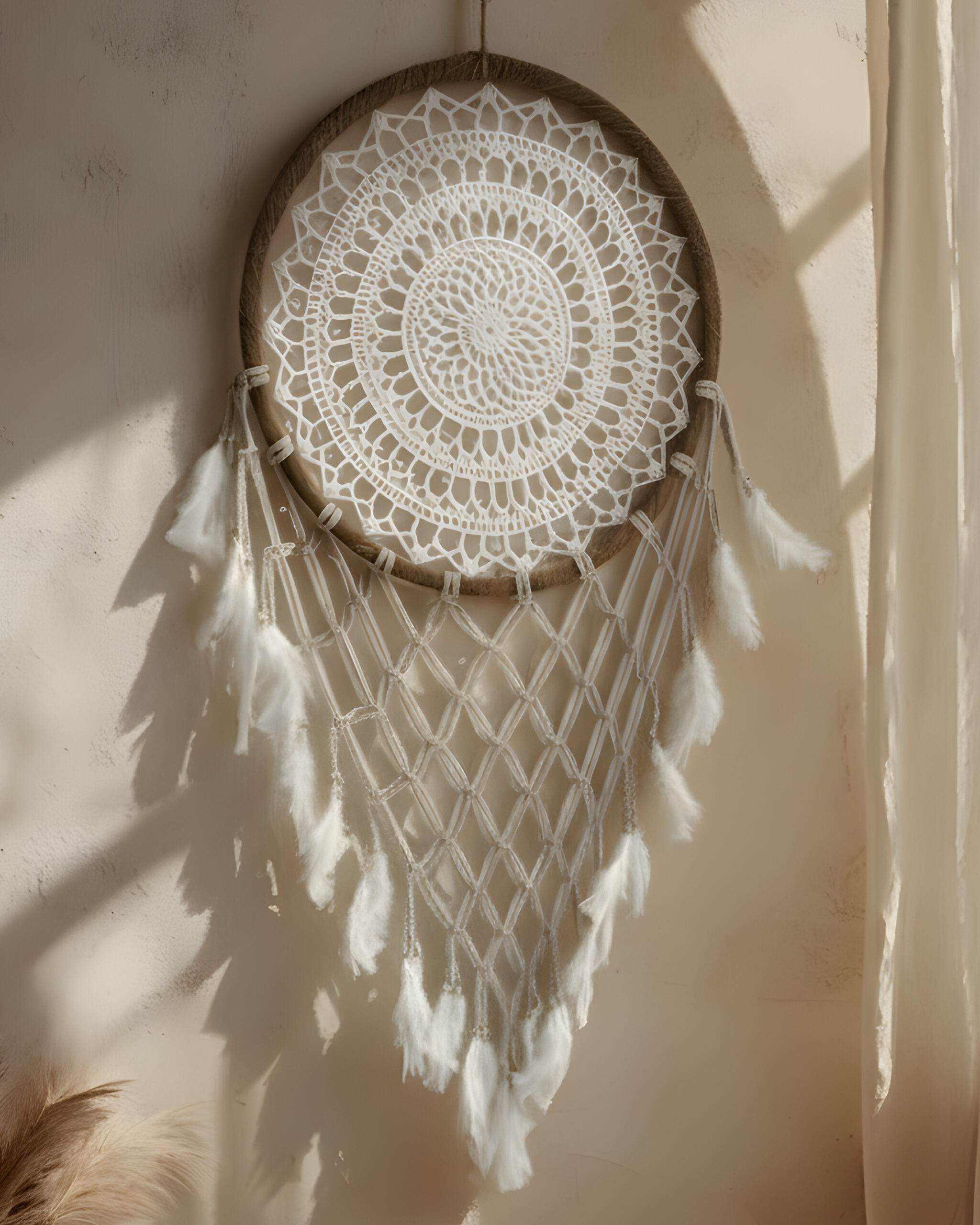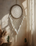 Each piece is entirely handcrafted, featuring a sturdy outer ring wrapped in natural twine and an intricate hand-woven macrame web at the center. Natural and Bohemian Style: We use sustainable materials including natural fibers (Macrame/Crochet), wooden beads, and soft, cruelty-free feathers.