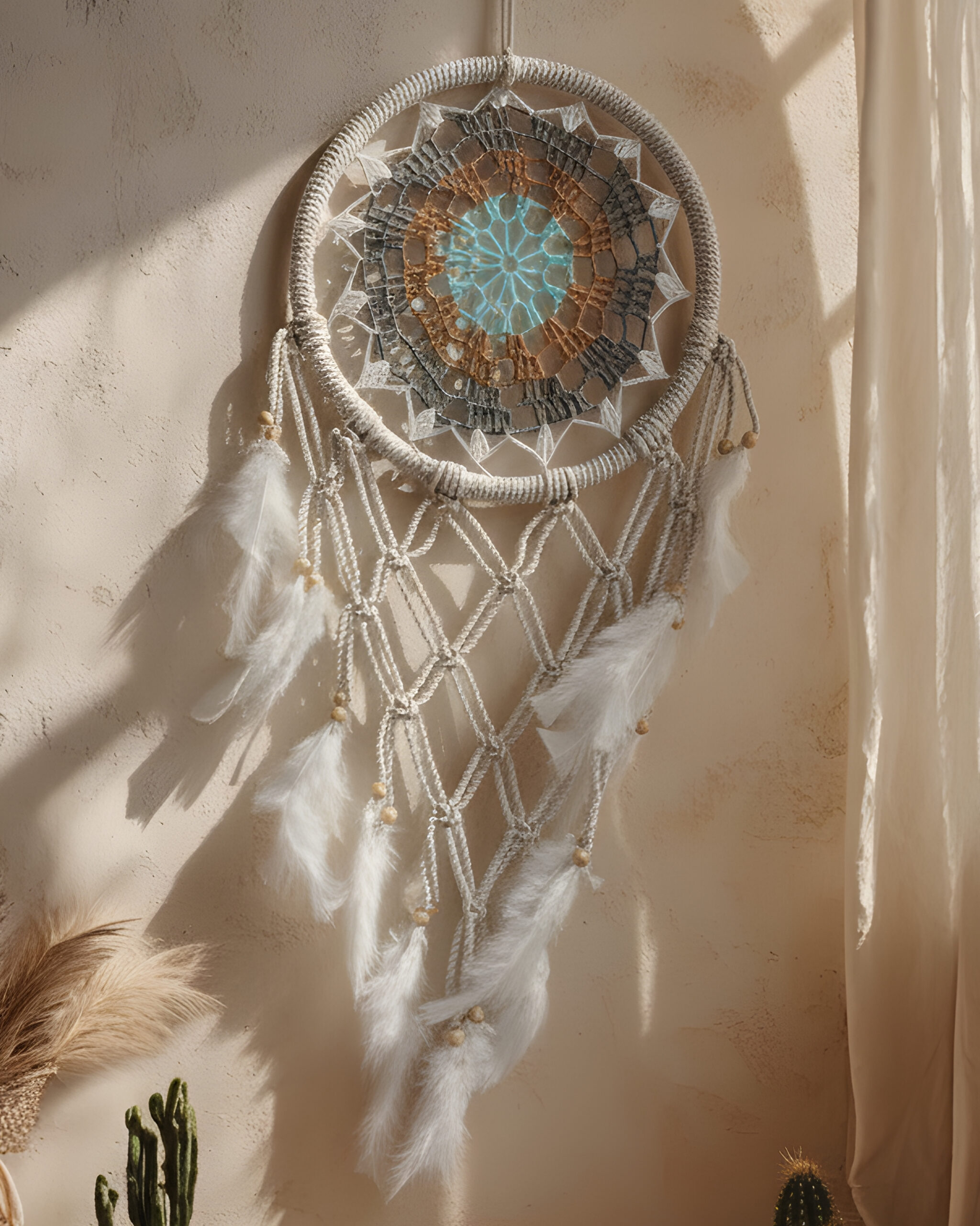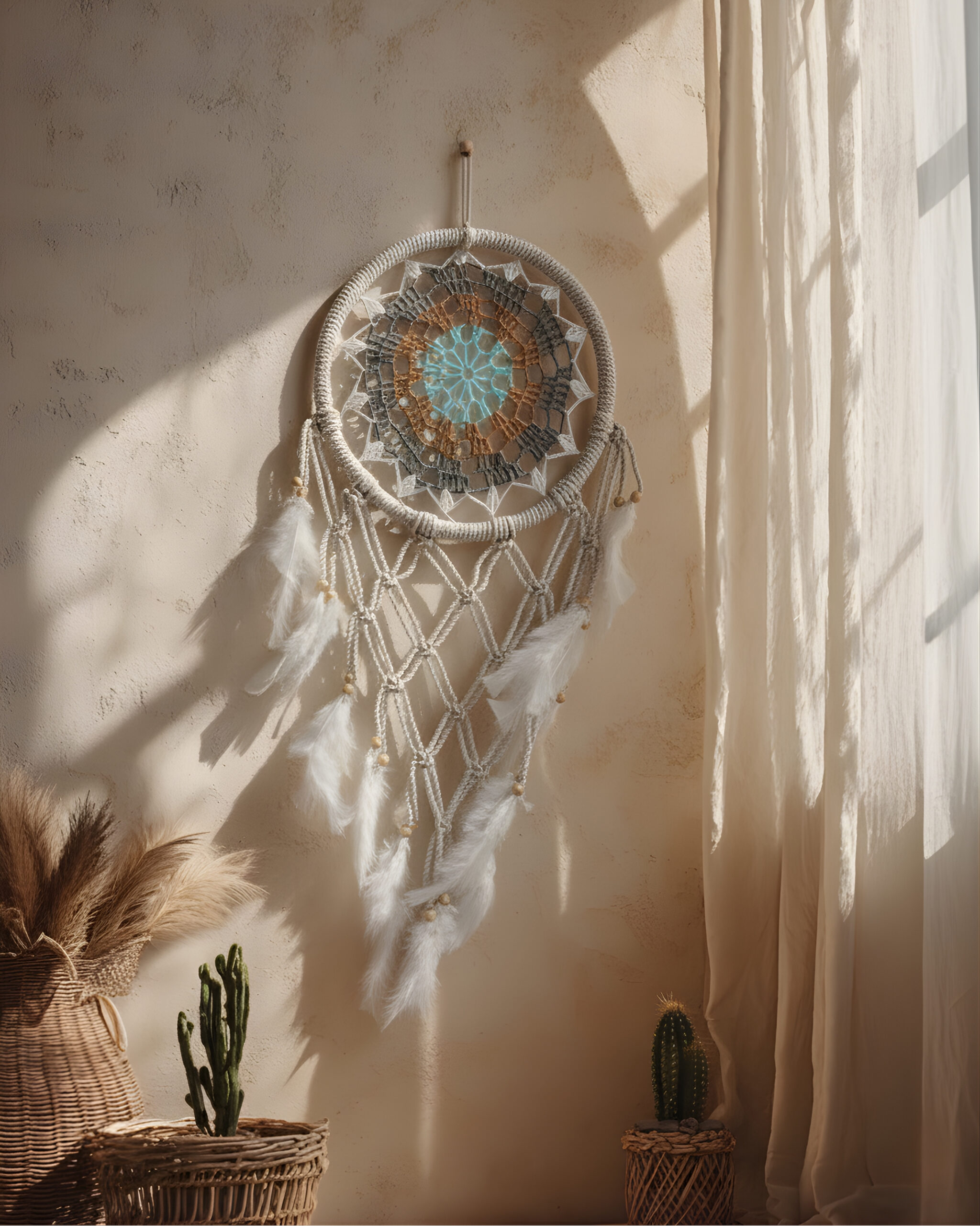 Each piece is entirely handcrafted, featuring a sturdy outer ring wrapped in natural twine and an intricate hand-woven macrame web at the center. Natural and Bohemian Style: We use sustainable materials including natural fibers (Macrame/Crochet), wooden beads, and soft, cruelty-free feathers.